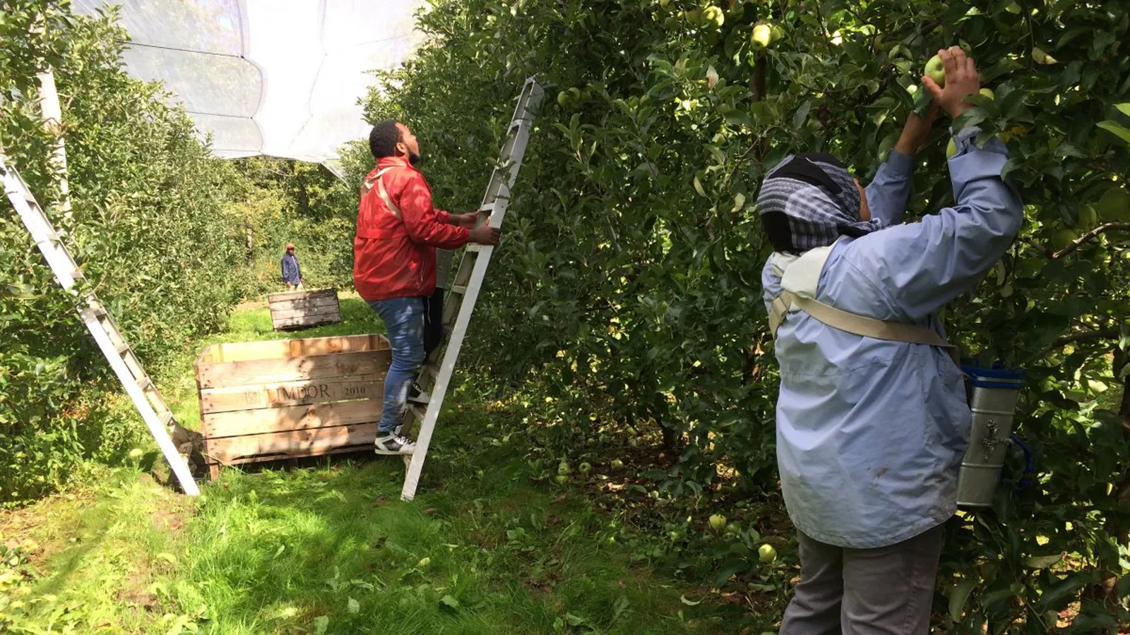 من الضروري توفير سلالم خفيفة وقوية للعمال. ولأجل راحتهم، يجب تجنب السلالم الطويلة جداً، وتدريب جميع العمّال على كيفية استعمالها بحذر قبل بدء عملية الجني. كما ينبغي توظيف العمّال الذين يشعرون بالارتياح عند العمل فوق السلم. ويُقدّر أن العامل يفقد 10٪ من كفاءته في كل مرة يصعد فيها درجة على السلم ابتداءً من الدرجة الثالثة، مقارنة بعامل له قدماه على الأرض. وبالتالي، يجب تجنب جعل الأشجار عالية جداً. وفي بعض الحالات، من الأفضل الاستغناء عن جني الثمار الموجودة في الفروع العالية جداً؛ والأفضل من ذلك تقليمها خلال عملية التشذيب. فالوقت الذي يُقضى في تسلق أماكن مرتفعة وخطرة من أجل قطف بعض التفاحات القليلة لا يكون مربحاً.
